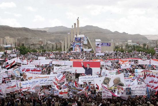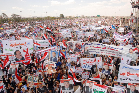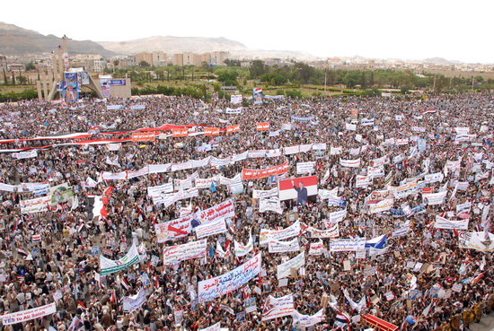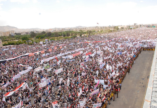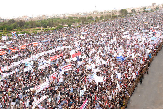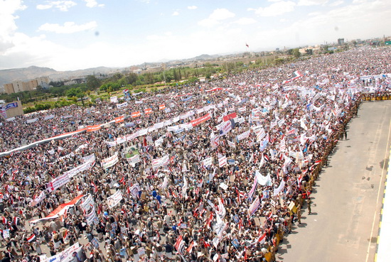 جمعة الشرعية الدستورية :ملايين من أبناء اليمن يسطرون صورة رائعة من صور التمسك بالشرعية الدستورية ورفض الانقلاب عليها ...حشود ملاينيية جاءت إلى العاصمة صنعاء لأداء صلاة جمعة الشرعية الدستورية وتقديم مشهد جديد من مشاهد الرفض للانقلابات والفوضى والتخريب والعنف والتطرف والإرهاب ...الديمقراطية هي عنوان الوصول إلى السلطة وليس الانقلابات..هتفوا ككل مرة بصوت واحد :نعم للشرعية الدستورية ..نعم لعلي عبدالله صالح .